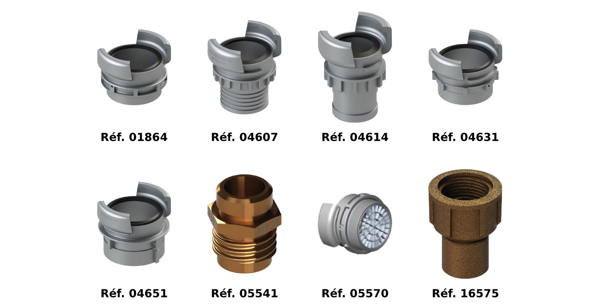 Parmi nos modèles certifiés NF 377 NS 61-701, nous vous proposons une large sélection de raccords (DSP40 ; DSP 50 ; DSP65 ; AR100 et GFR) qui s’adaptent et se fixent sur tous nos produits et qui ont pour but de répondre à tous les besoins des Sapeurs-pompiers que nous équipons dans le monde.